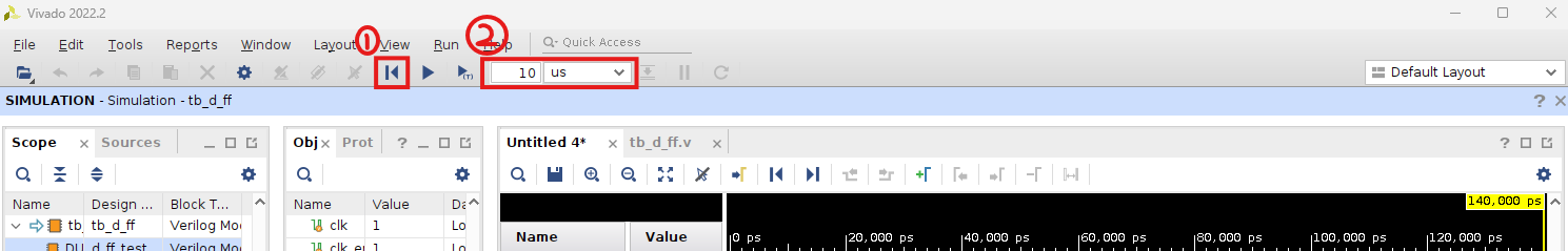 1번을 클릭해 실행전 상태(초기 상태)로 만든 후 2번에서 simulation 시간을 설정한다.