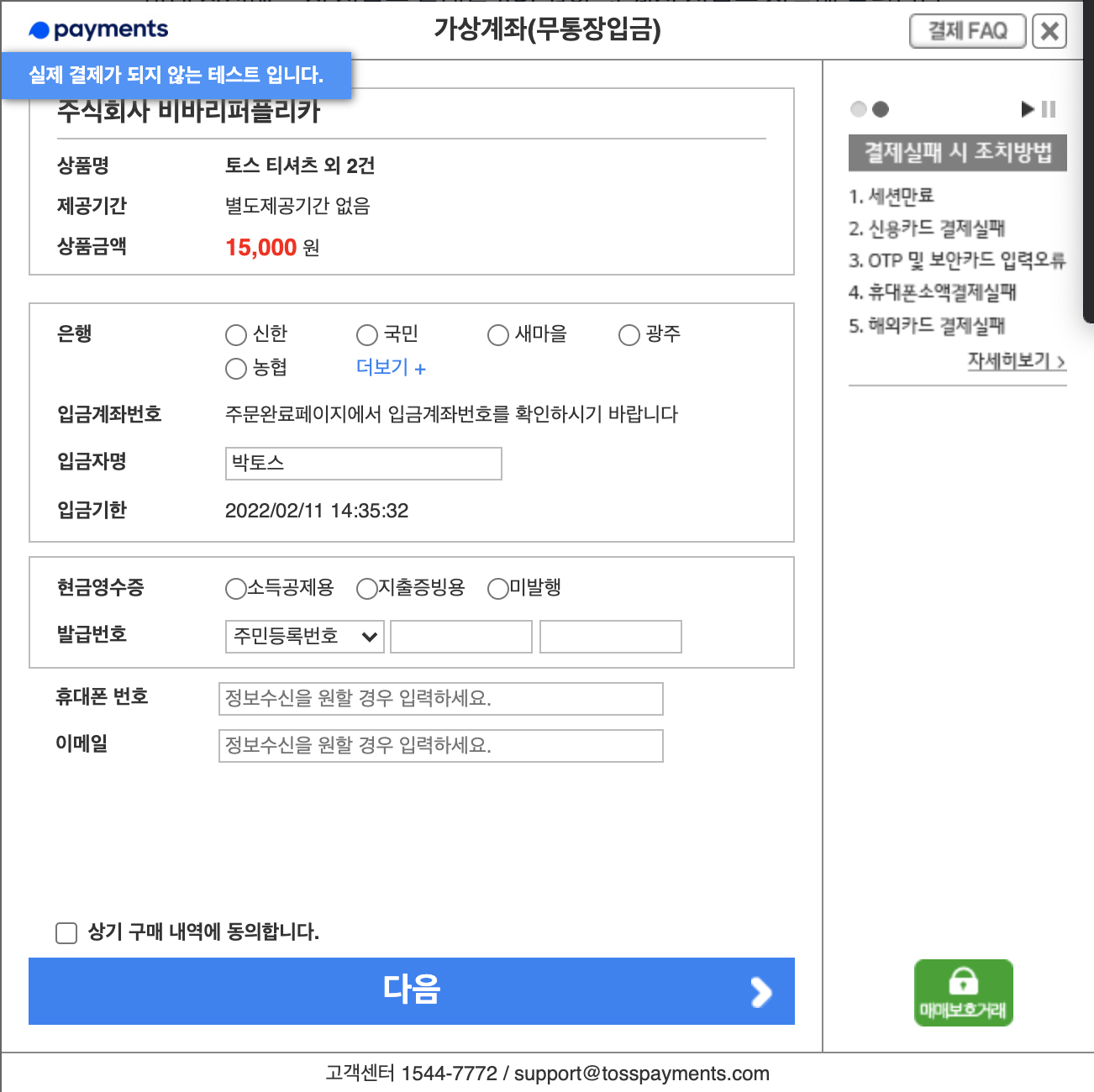 위의 코드가 실행되면 아래와같이 toss payments의 기본 결제UI가 나타납니다.