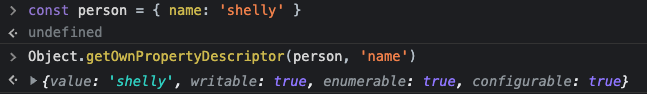 // { value: 'Shelly', writable: true, enumerable: true, configurable: true }