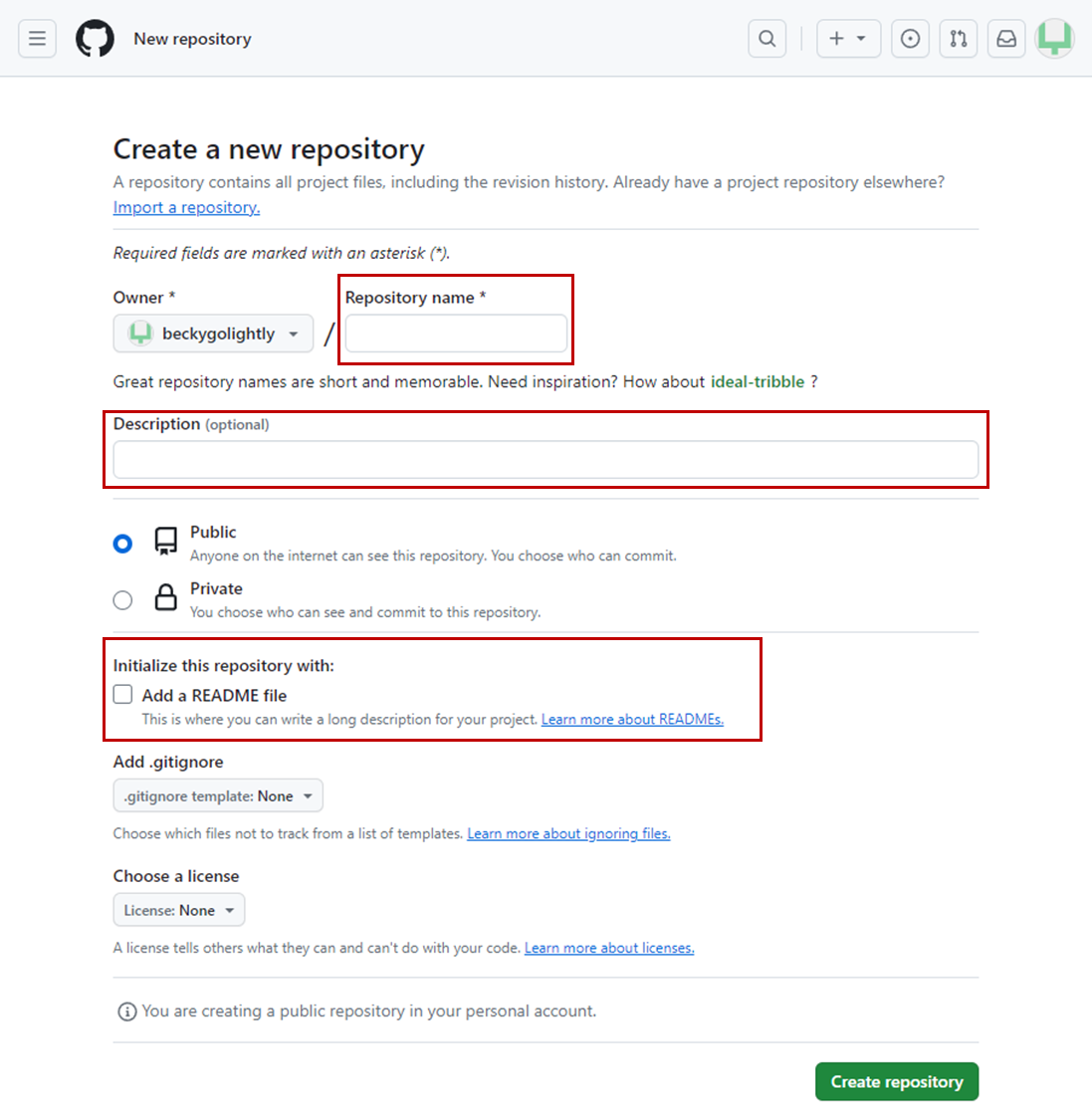 3. Repository Name / Description 입력 및 Add a README File 체크