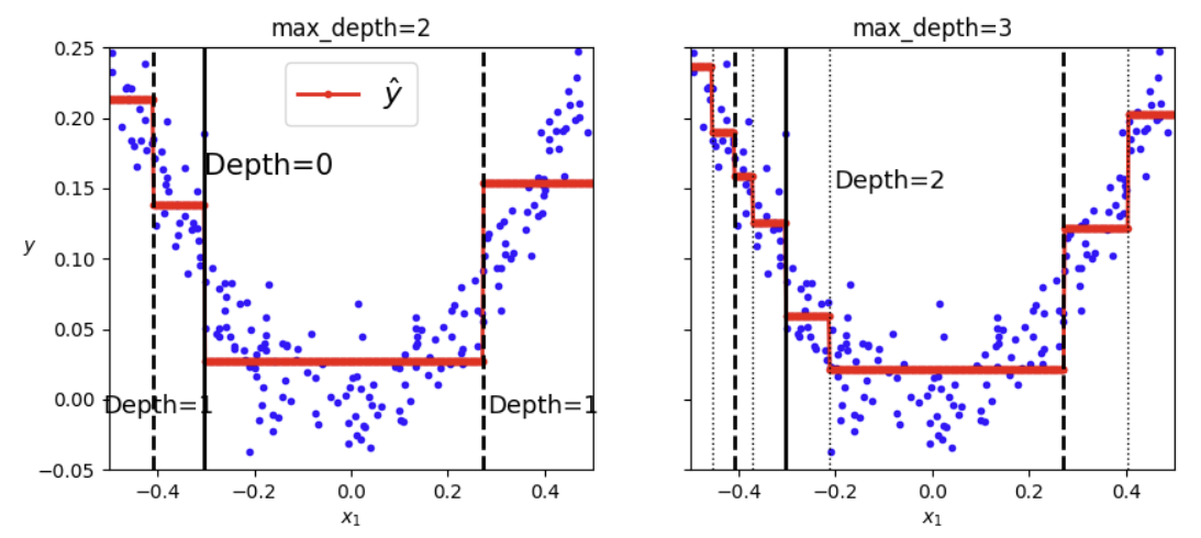 회귀 모델의 max_depth 파라미터를 3으로도 설정하여 분할을 나타내보았다. (파란점들은 샘플들을, 빨간선들은 각 구간에서 평균 예측값(타깃값)을 의미한다.)