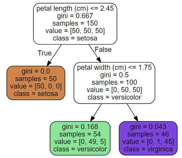 iris dataset에서 두 피처(petal length, petal width)를 이용하여 분류 모델을 학습하고 시각화한 결과이다. 데이터는 depth=0인 root node에서 시작하여 자식 노드가 없는 leaf node까지 이동한다. 만약 petal length가 2.45보다 작거나 같다면 depth=1인 왼쪽 노드로 이동하게 되고, 이는 하나의 피처로만 구성된 순수 노드이기 때문에 class=setosa에서 알 수 있듯, setosa로 분류됨을 알 수 있다. 그리고 만약에 petal length가 2.45보다 크고 width가 1.75보다 작거나 같다면 depth=2의 왼쪽 노드까지 이동하게 되며 class=versicolor에 따라 이로 분류됨을 알 수 있다.