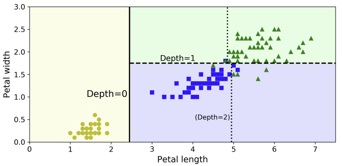 아래 그림은 decision tree의 decision boundary를 나타낸 것이다. 수직인 직선은 root node(Depth=0)의 결정 경계선(petal length=2.45)을 나타낸다. 이 선을 기준으로 Iris-Setosa만 있는 왼쪽은 pure하고, 오른쪽은 impure하기 때문에 Depth=1에서 petal width=1.75를 기준으로 굵은 점선으로 나뉜다. 위 모델을 만들 때 max_depth=2로 설정하였기에 분기는 여기서 멈춘다.