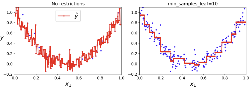 decision tree의 이러한 특성 때문에 학습 도중에 freedom을 제한해야 한다. 이는 regularization이라고 하며, 여러 하이퍼파라미터를 이용하여 수행할 수 있다.