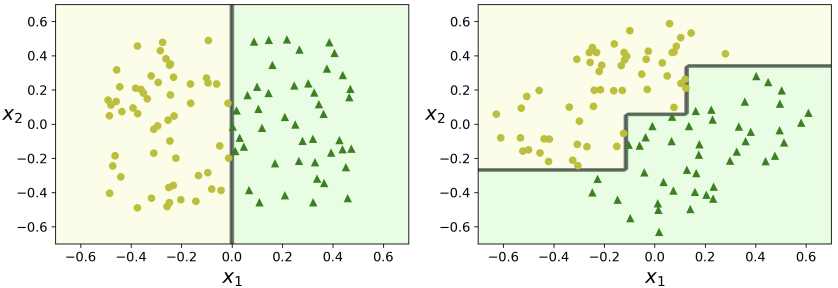 CART algorithm은 Classification And Regression Tree로, 이름에서 알 수 있듯이 분류와 회귀 문제에서 사용된다. 먼저, 이 알고리즘은 단일의 피처 k 와 threshold 를 이용하여 training set을 두 개의 subset으로 분리한다. 이때 k와 는 CART 손실함수를 최소화하는, gini 불순도를 최소화하는, 즉 가장 순수한 subset을 만드는 방향으로 구해야 한다.