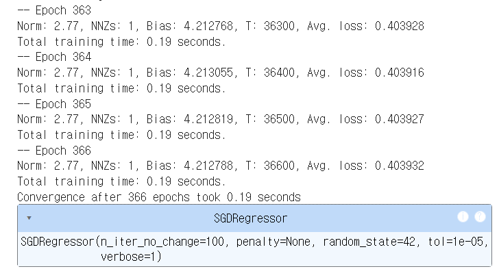 위 코드와 sklearn 문서에서 모델 파라미터에 대한 설명을 비교했을 때, 코드에 early_stopping이 설정되지 않아도 tol과 n_iter_no_change에 따라 멈출까 의문이 들었음. 그런데 verbose=1로 설정해서 학습 과정과 멈춘 시점을 확인했더니 epoch가 366으로 수렴했음을 확인할 수 있었음