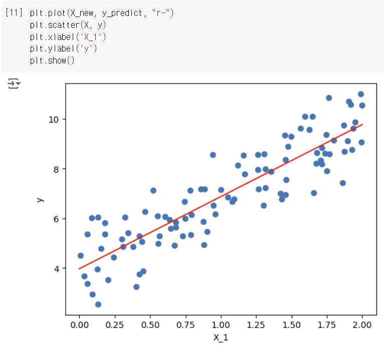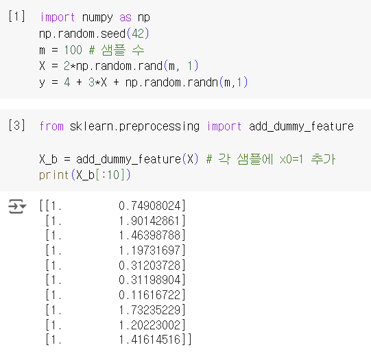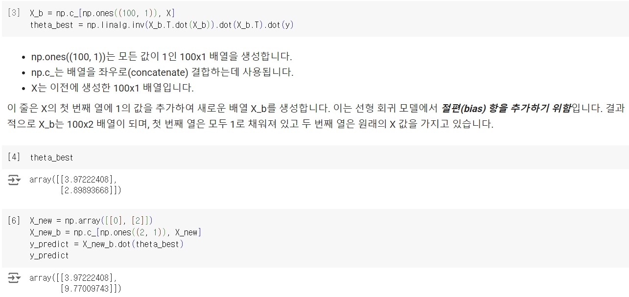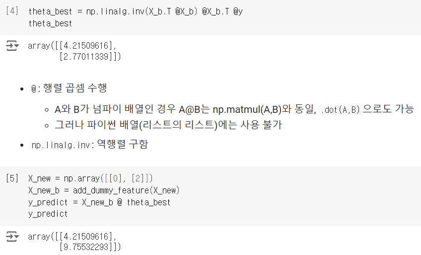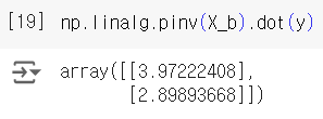 학습 데이터에 절편항을 추가하고, X_b와 y를 normal equation에 넣어 를 구했다. 정답값은 4와 3이지만, gaussian noise 때문에 3.97, 2.89로 나온듯하다.
