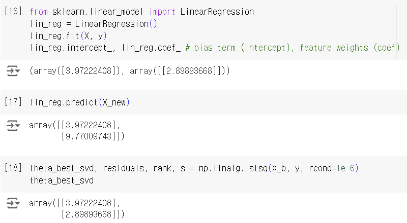 scikit learn에 있는 LinearRegression 클래스를 이용할 수도 있다. 물론 이 방법은 closed-form equation이 당연히 아니지만, 책에서는 normal equation과 사이킷런의 LinearRegression 함수의 성능을 비교해보고자 넣은 것 같다.