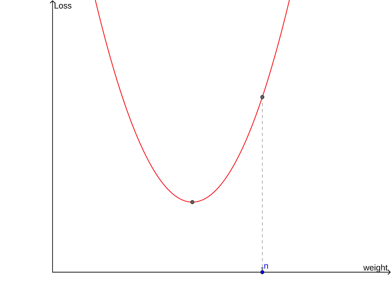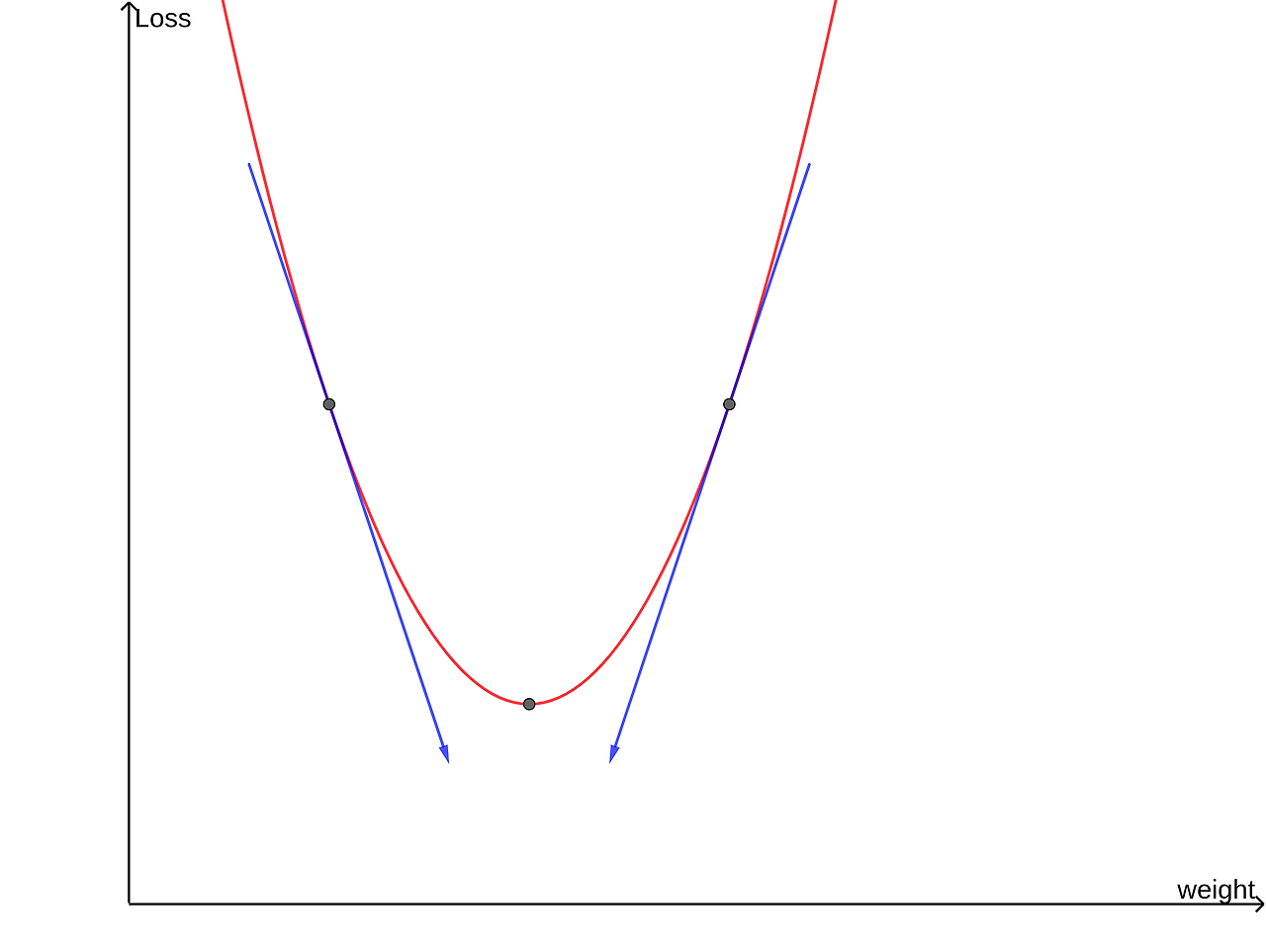 이 함수가 최소가 되려면 w를 양의 방향으로 이동시켜야 한다. -> w=w+양수