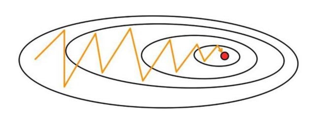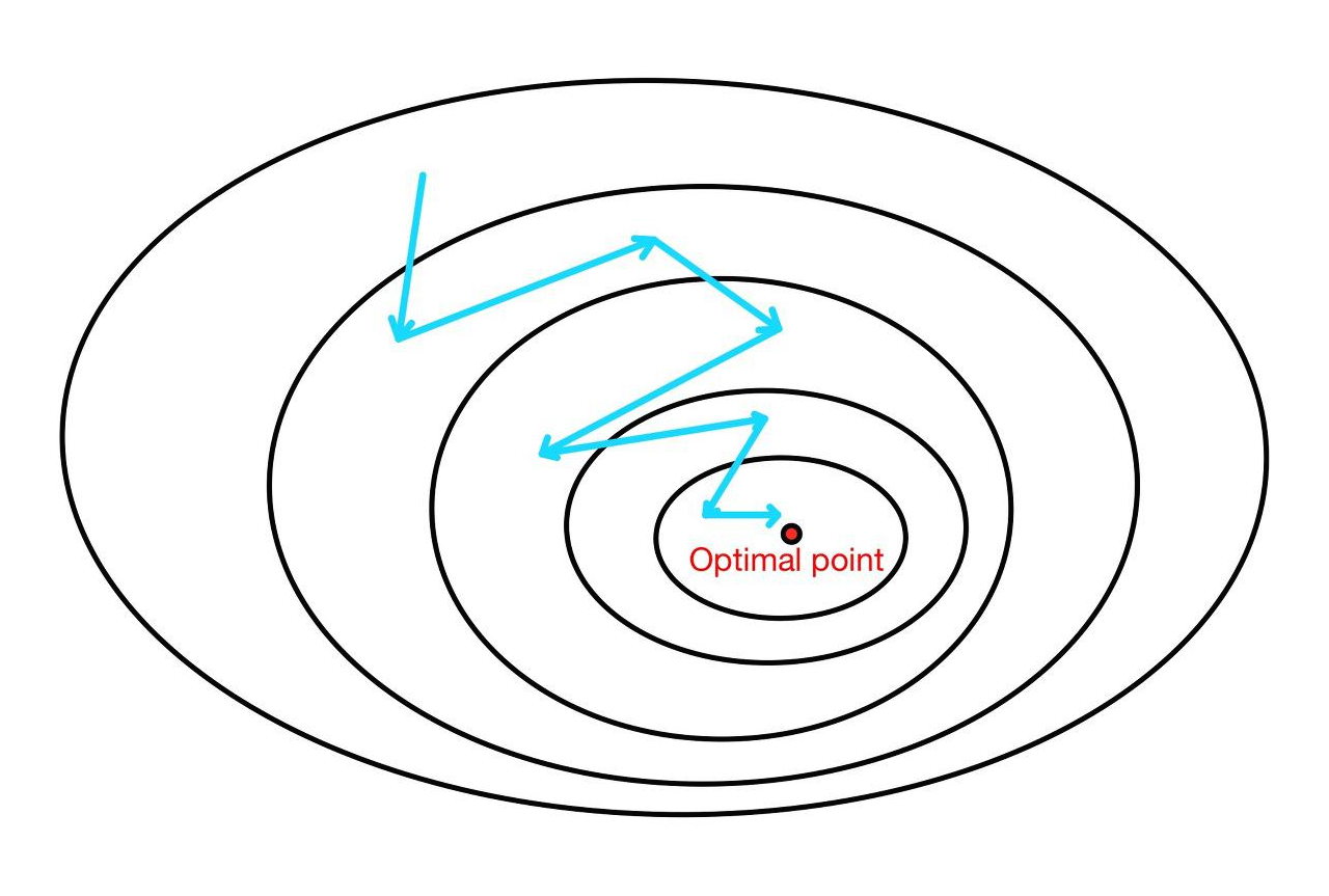경사 하강법은 시작 지점에서 최적값의 방향으로 수렴하는 것이 아닌, 기울기를 따라 조정되며 수렴한다. 만약 가중치들이 손실 함수에 미치는 영향이 상이하다면 위 그림처럼 크게 진동하며 최적값에 느리게 수렴할 수 있다. 이를 Oscillation(진동) 현상이라고 한다.