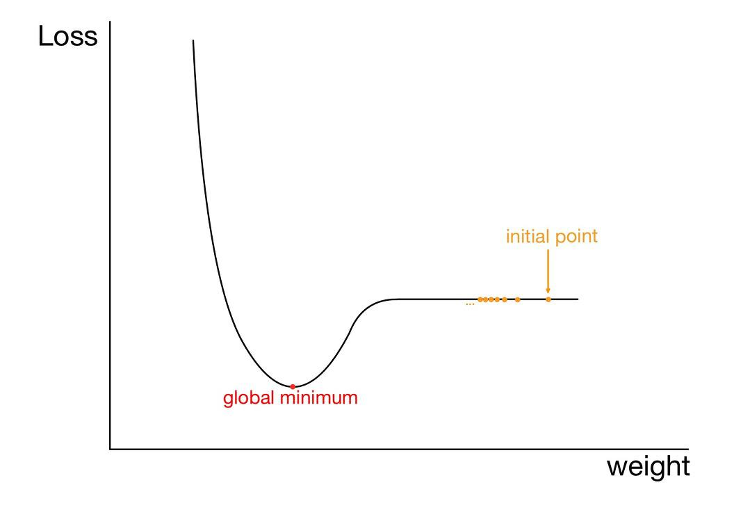 위의 시작점처럼 평탄한 지역에서는 기울기가 0에 수렴하므로 가중치가 업데이트되지 못할 수 있다.