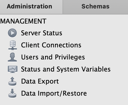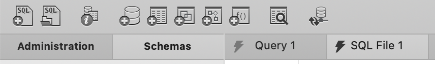 실제 데이터베이스 사용은 Administration 옆의 Schemas탭에서 가능하다.