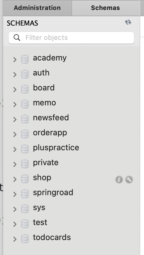 그간 터미널에서 직접 CREATE DATABASE ~; 명령어로 만들었던 db들