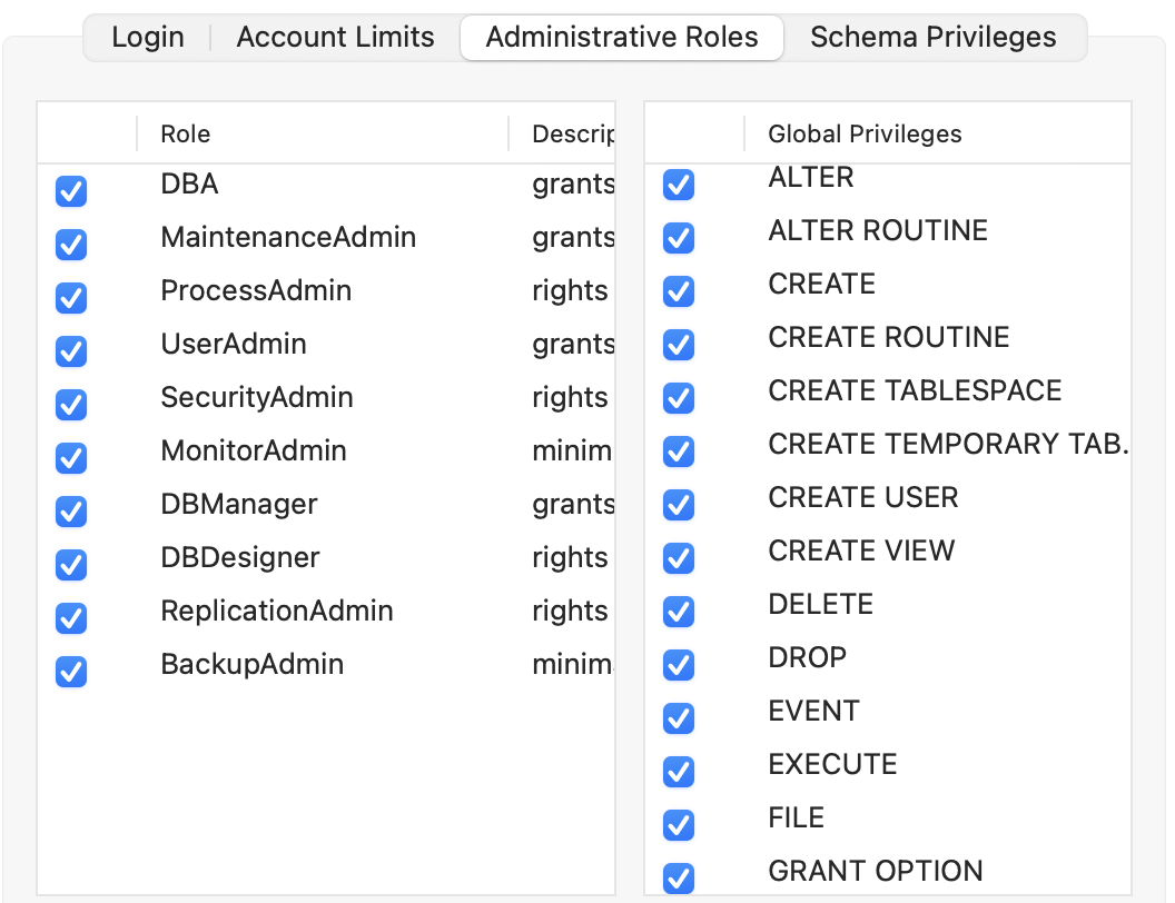 DBA 선택 시 모든 체크박스가 체크되며 모든 권한을 부여할 수 있다.