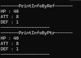 위 주석에서 보았듯이 포인터와 참조는 앞의 표기와 동작의 방법만 다를뿐 (.과 ->) 결과는 동일하게 출력된다.