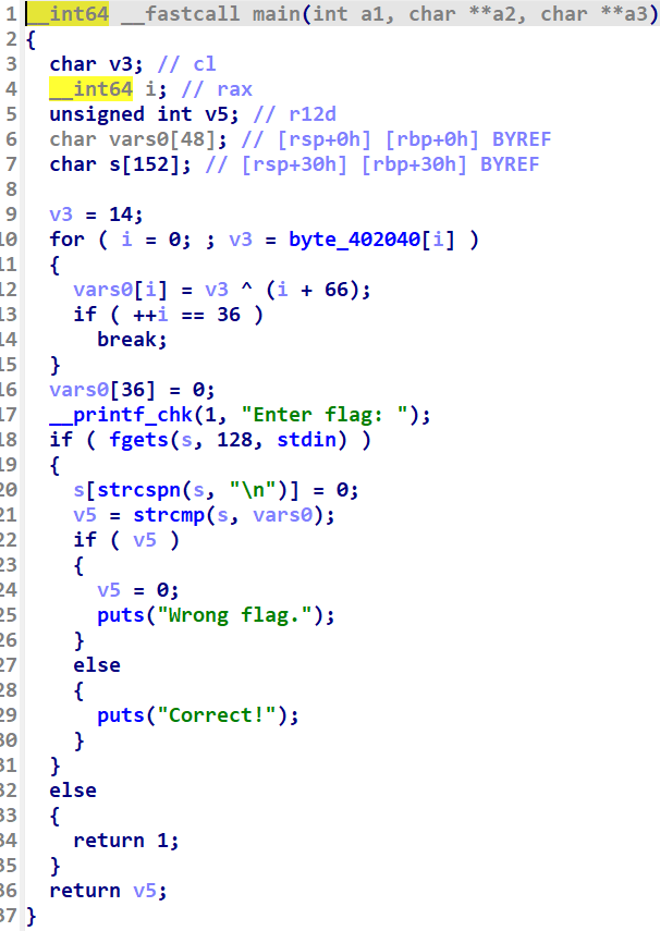 마찬가지로 문제 파일을 다운 받은 후, IDA로 디컴파일하여 main함수를 보았다.