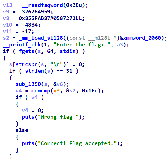 s2에 xmmword_2060에 값을 넣고 입력받은 문자열과 v6의 주소값을 인자로 사용하여 sub_1350을 실행한다.