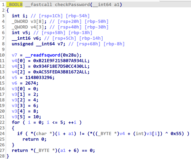 함수 checkPassword를 확인해보면 다음과 같은 입력값을 검증하는 코드를 확인할 수 있다.