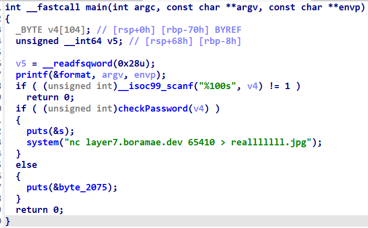 입력받은 문자열 v4를 인자로 갖는 함수 checkPassword 에서 참이 반환되면 realllllll.jpg 라는 파일을 서버에서 내려받는 시스템이다.