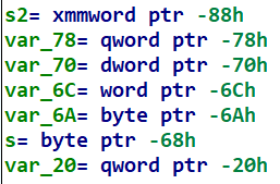 var_78은 8바이트, var_70은 4바이트, var_6C는 2바이트, var_6A는 1바이트를 갖는 스택 프레임의 변수 레이아웃이였다.