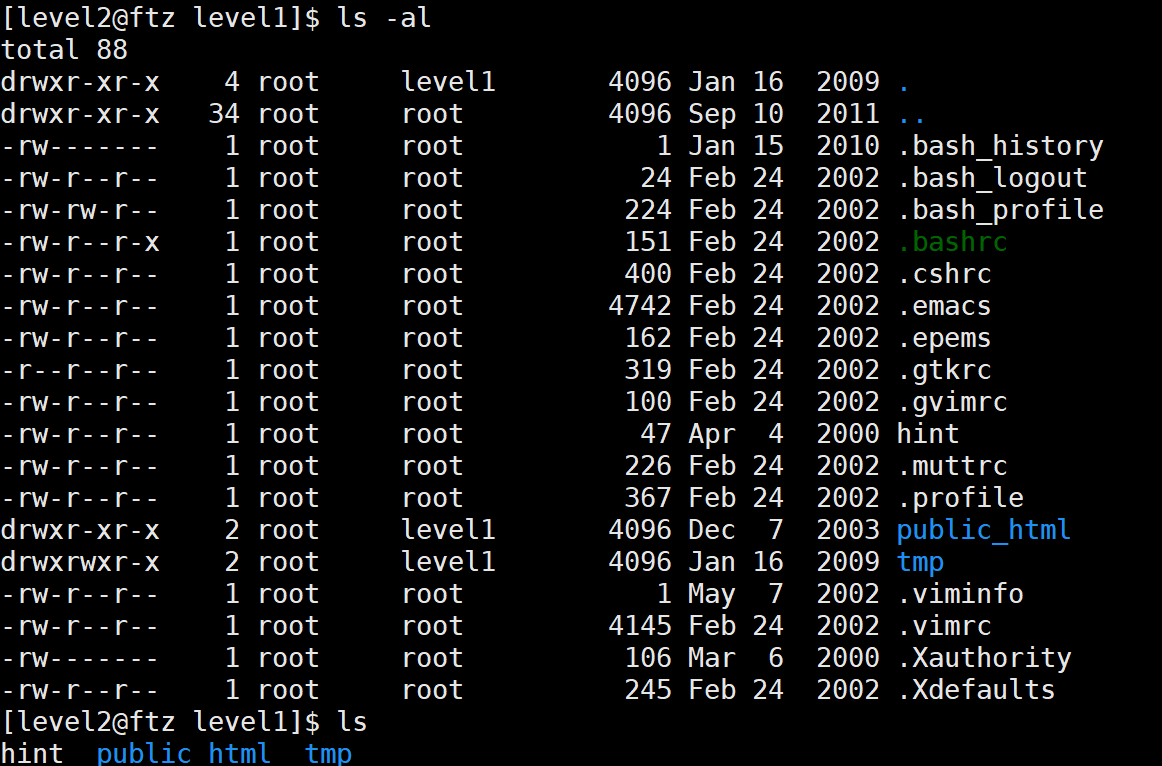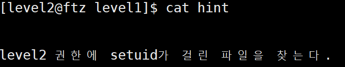 보니 현재 level1 디렉토리 안에 hint라는 파일이 있다는 것을 확인할 수 있다.