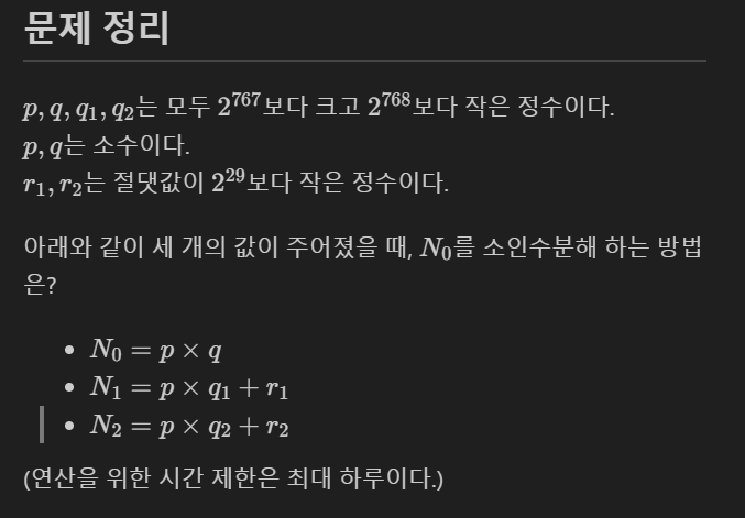 r1, r2만 N1, N2로부터 제외시킬 수 있다면 아무거나 gcd(N0, N1) 연산으로 빠르게 p를 구할 수 있다고 생각했다.