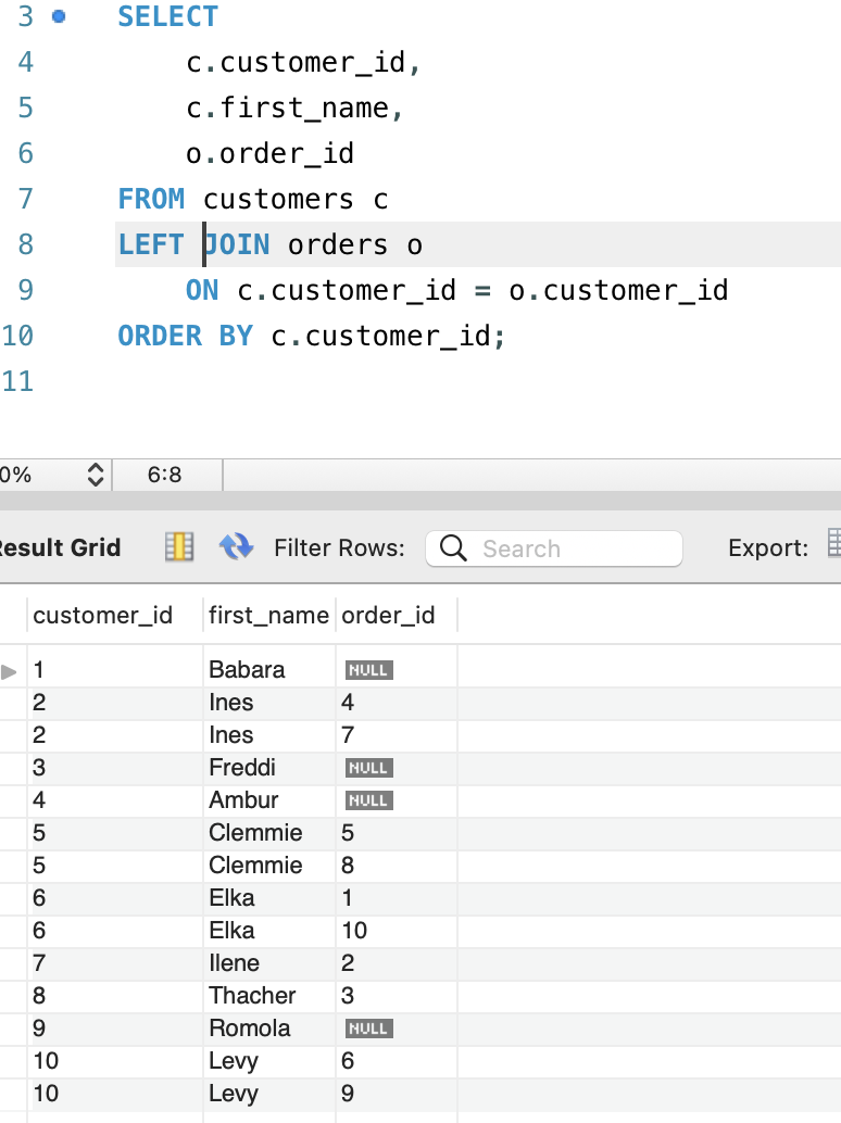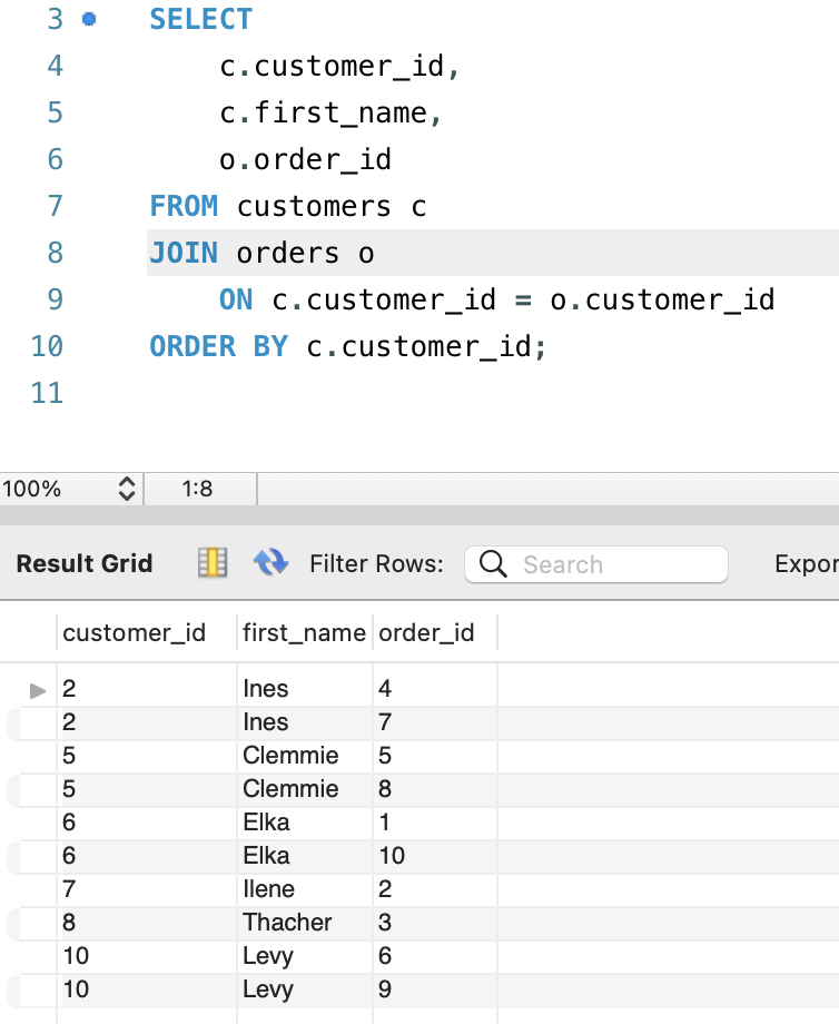 NATURAL JOIN customers c; < === natural join lets the mysql db to infer this query based on the common column from both table.
