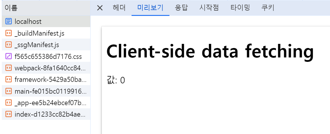 SSG와 SSR 방법과는 다르게 client에서 렌더링을 하기 때문에 미리보기 창에는 값이 출력되지 않는다(초기 상태인 0으로 pre-rendering 함).
