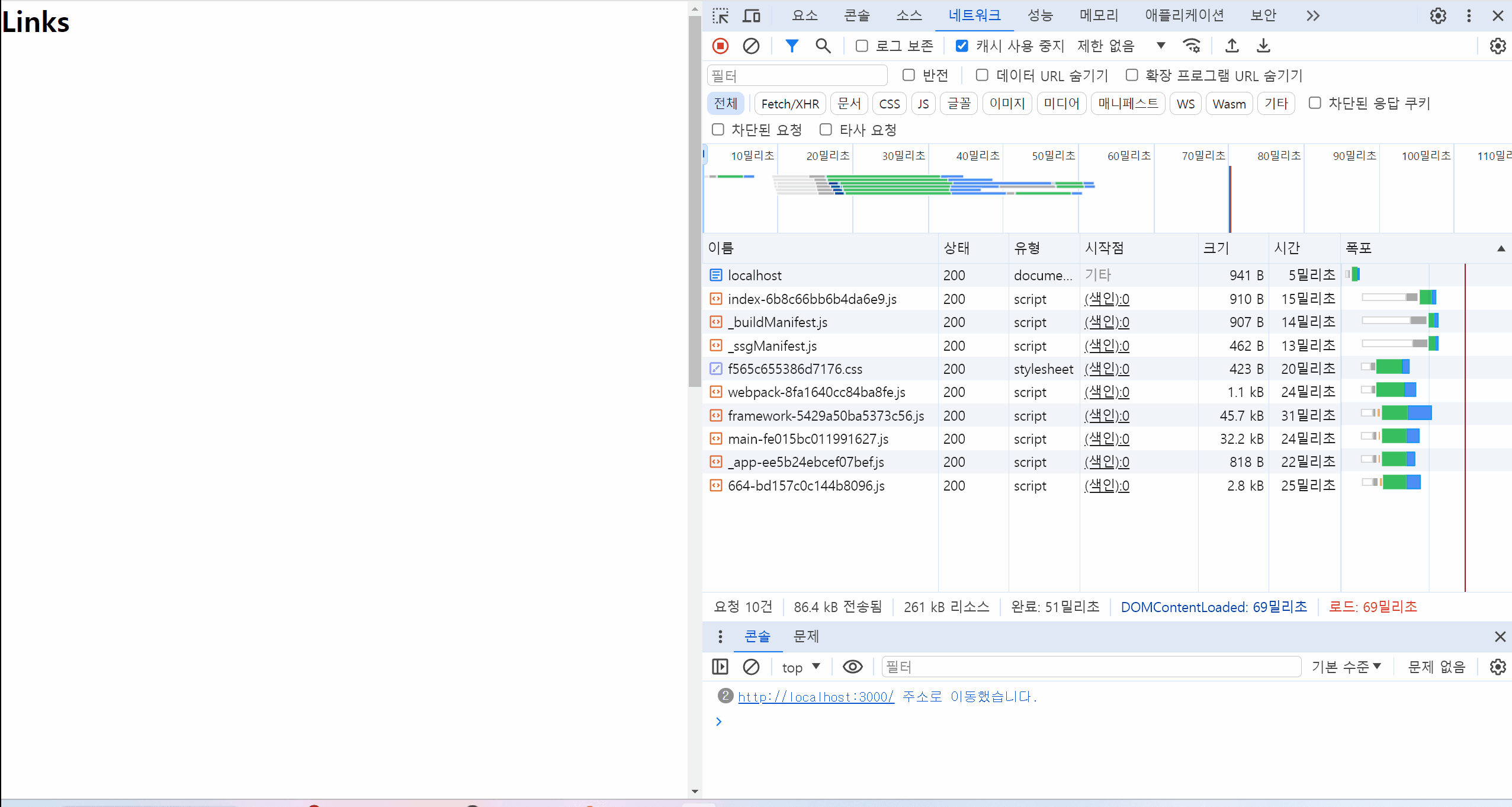 위 코드의 link 태그가 a태그의 역할을 수행해 link를 생성하고 웹페이지가 처음 불러올때 기존 페이지의 Html문서와 이후 페이지의 js 파일을 불러온다. 기존 페이지에서 다음 페이지로 넘어갈때 js 코드를 CSR 방식으로 렌더링한다.