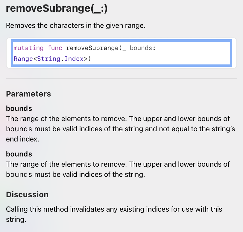 removeSubrange(startIndex..<endIndex) 메서드는 지정한 index 범위 만큼의 string을 제거해준다.