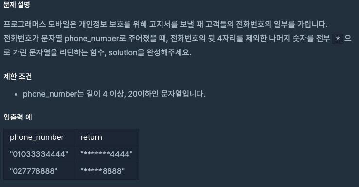 제일 처음 생각한 방법은 먼저 phone_number 문자열의 길이에서 4를 뺀 값을 구하고 그 값만큼 *를 반복하고 뒤에 문자열을 덧붙이는 방법을 생각했다. 그래서 코드를 다음과 같이 구현했다.