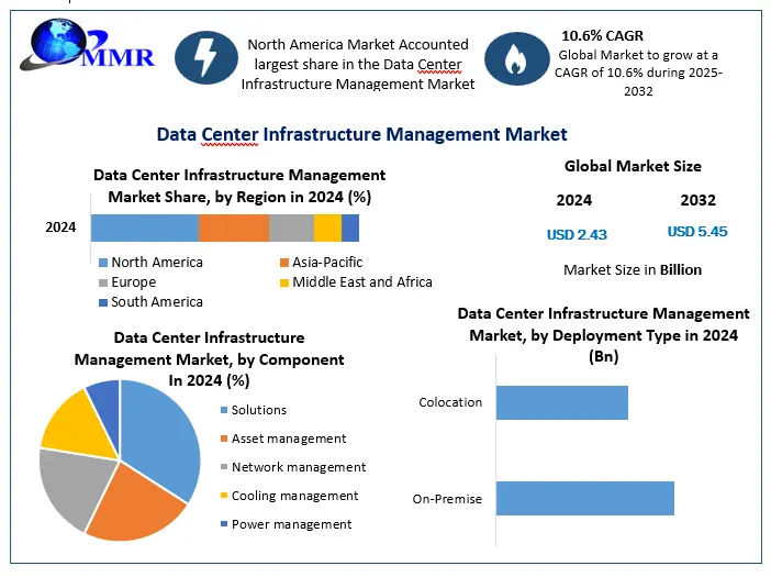 The Data Center Infrastructure Management Market Share was valued at USD 2.43 billion in 2024 and is expected to grow at a CAGR of 10.6%, reaching approximately USD 5.45 billion by 2032. DCIM refers to the integration of Information Technology (IT) and facility management to optimize the performance, reliability, and efficiency of data centers. DCIM solutions enable businesses to monitor, manage, and analyze all aspects of their data center infrastructure, including power, cooling, security, and space utilization, while reducing downtime and energy consumption.