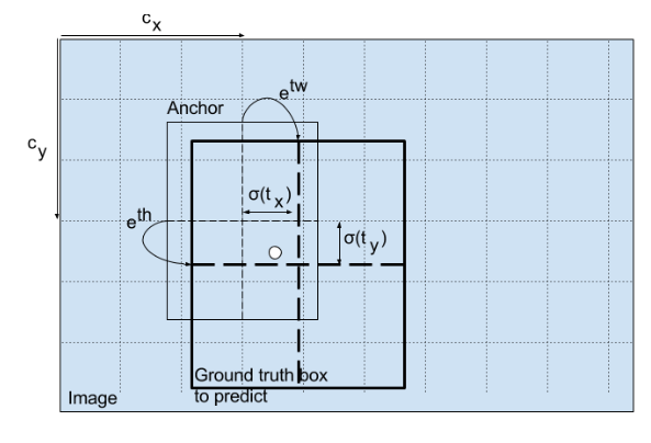 즉, 실제 GT box의 center point를 포함하는 cell이 해당 box에 responsible하고, 이 cell의 prediction값들은 '이 cell에 대해 정의된 anchor box들 중 GT box와 가장 IOU 값이 큰 anchor'의 offset이다.