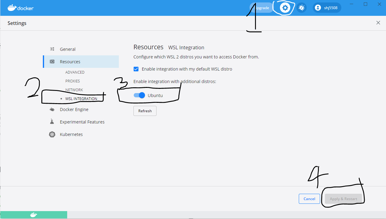 도커가 제대로 설치되었다면 다음과 같이 연결 설정에서 Ubuntu와 도커를 연결해야 한다.