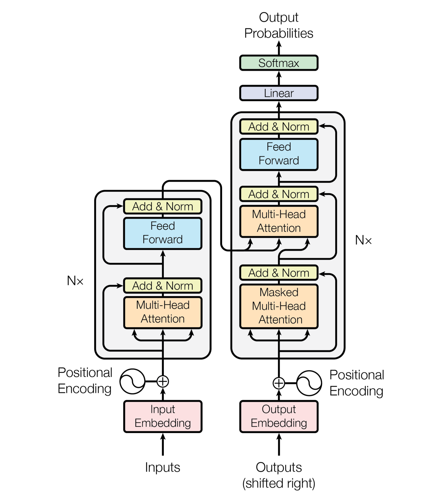 - Encoder의 두 개의 sub-layer에 더해 Decoder에는 encoder stack의 output에 대해 multi-head attention을 수행하는 세 번째 sub-layer를 추가한다.