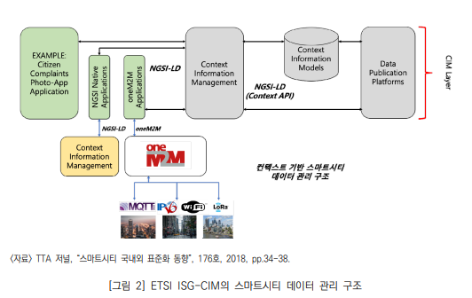 유럽전기통신표준협회 ETSI(European Telecommunications Standards Institute)는 우리나라의 한국정보통신기술협회 TTA(Telecommunications Technology Association)에 해당하는 통신 산업 분야의 표준화 기구로 스마트시티 관련 표준 개발을 다양한 방면에서 진행하고 있다. 특히, 기술 전문가 그룹을 통해 유럽 내 산업 표준을 개발하는 Industry Specification Group(ISG)를 통해 스마트시티 관련 표준 개발을 지원하고 있다. 그 중에서도 Context Information Management(CIM) 그룹에서는 이기종 데이터들을 상호연동하기 위해서 필요로 되어지는 시맨틱 기술과 컨텍스트 기반의 데이터관리를 제공하는 핵심 API의 집합체인 NGSI-LD 표준 개발을 진행하고 있다.