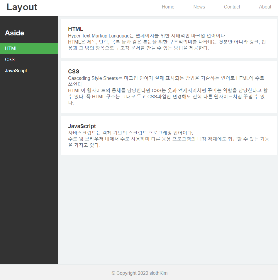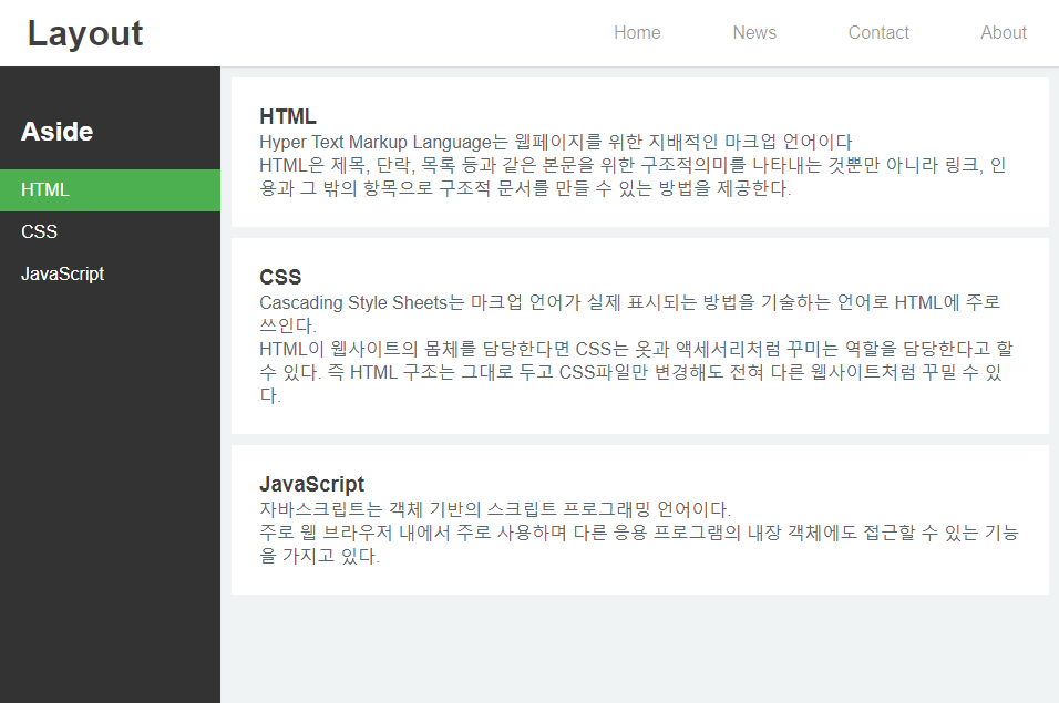Section은 콘텐츠 영역, Aside는 부가 정보 영역, Section영역은 다시 article영역으로 구분할 수 있다.