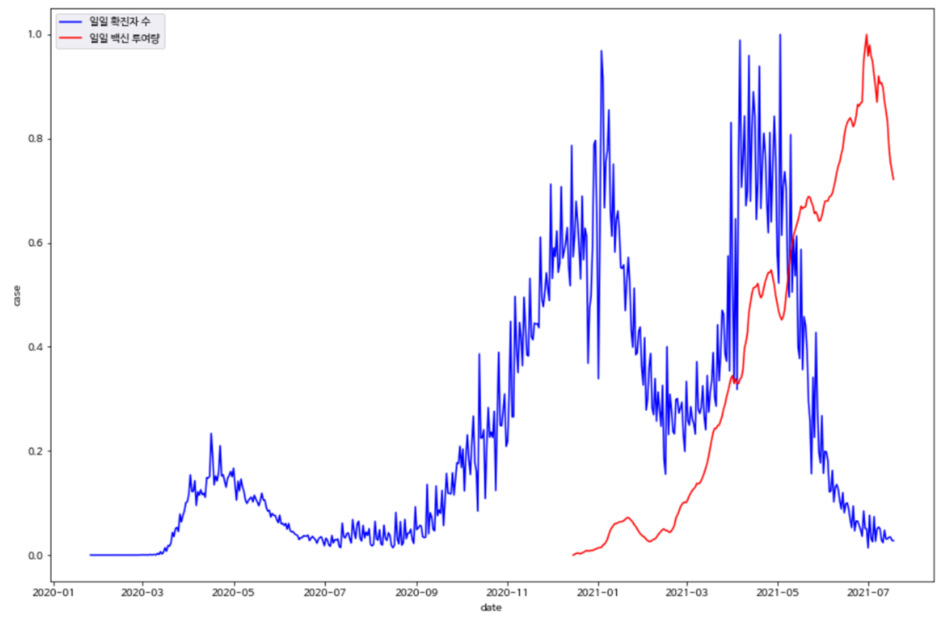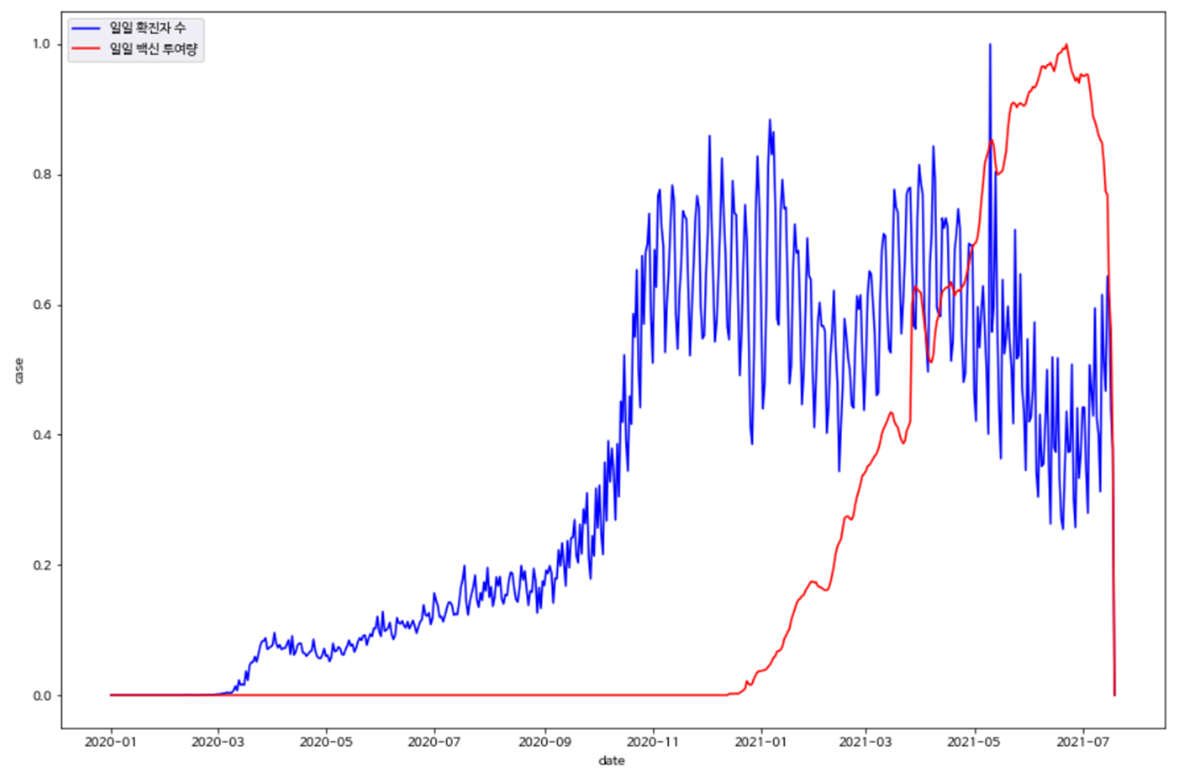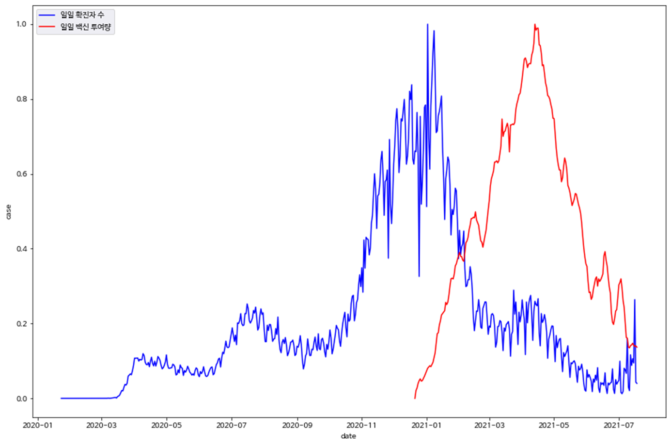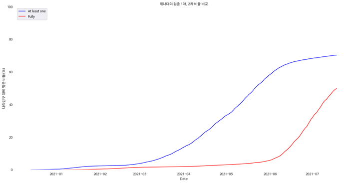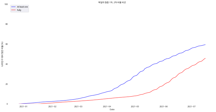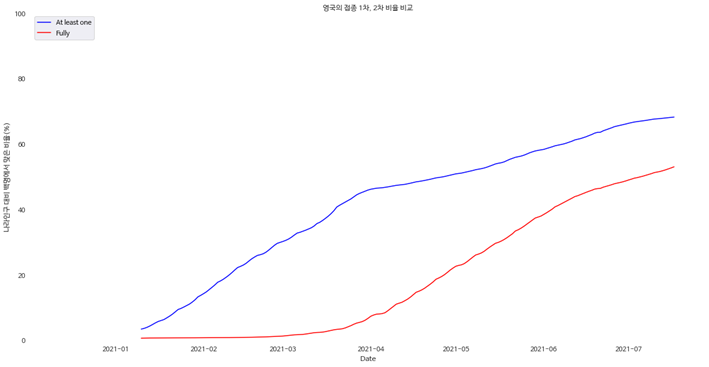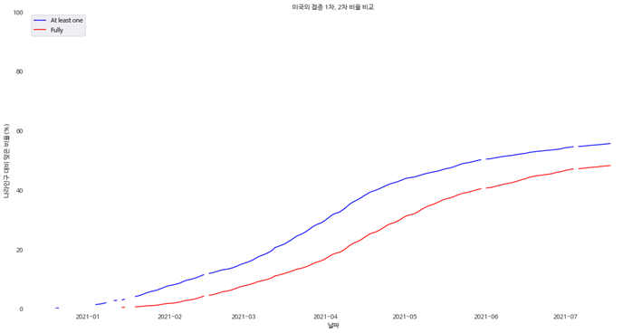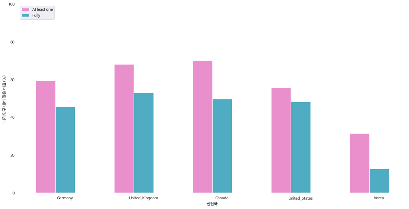 • 한국(우측): 1차 접종률과 2차 접종률의 차이가 비교적 큼 -> 백신의 효과 적음