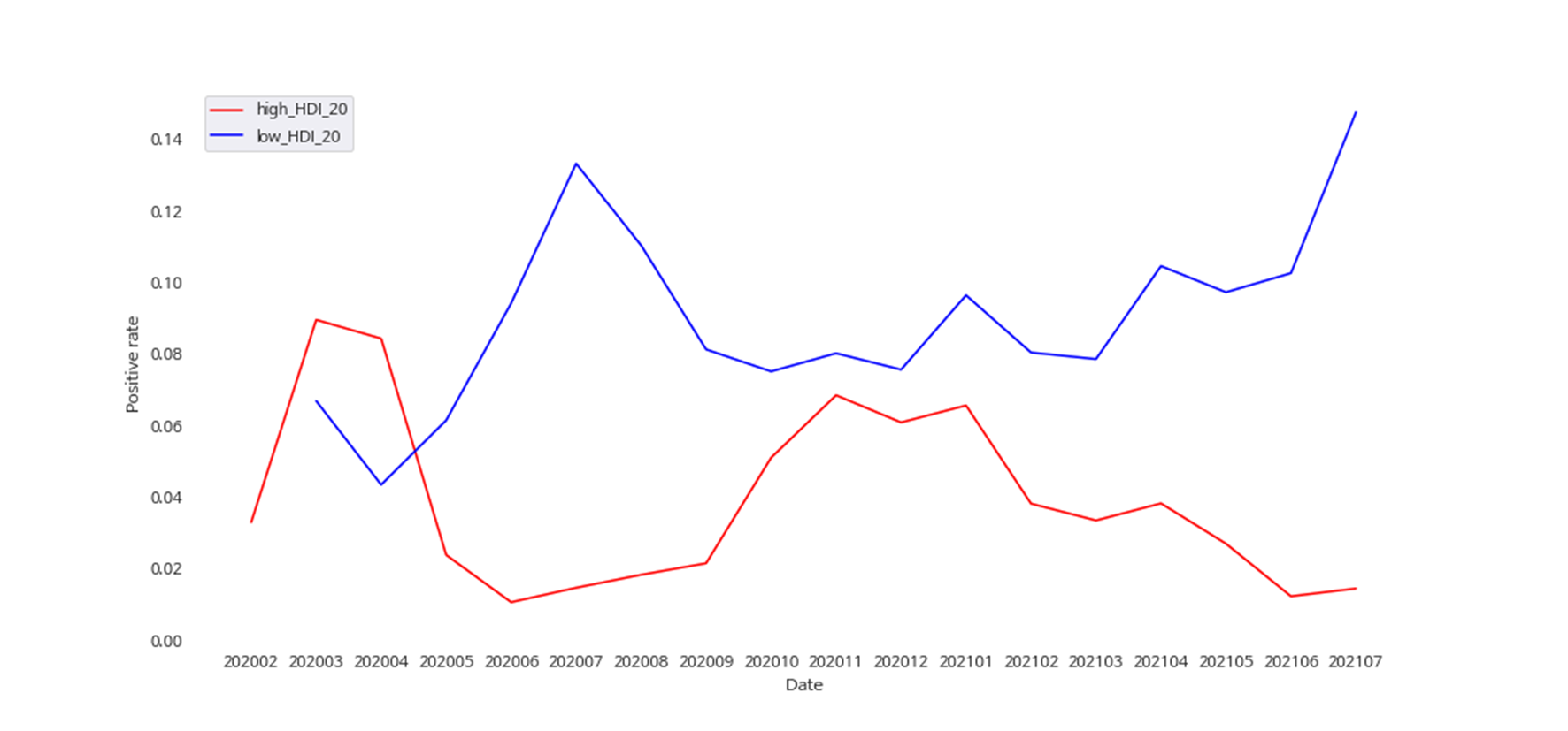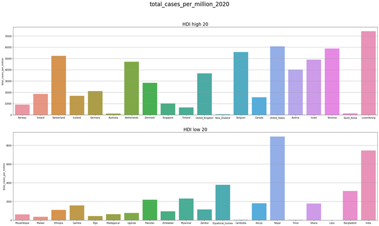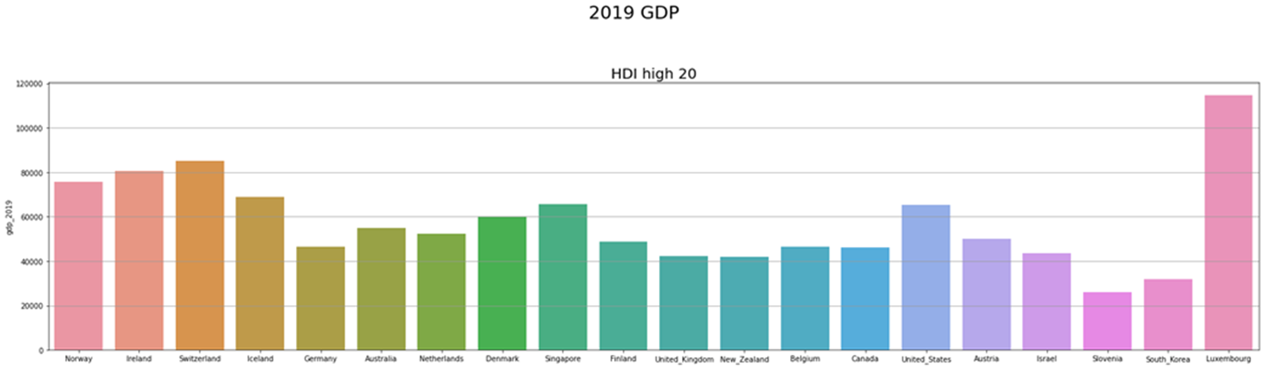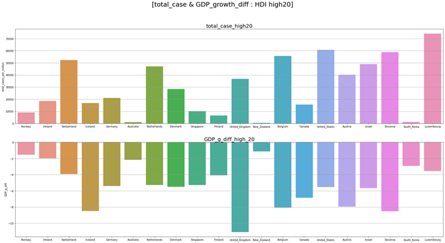 - 룩셈부르크, 스위스: 2019년도 GDP가 인구개발지수 상위 20개 국 중에서 각각 1위, 2위 차지 -> GDP가 높아 경제적 안정성이 있는 국가의 경우 코로나가 극심해도 경제적 피해 정도는 낮음
