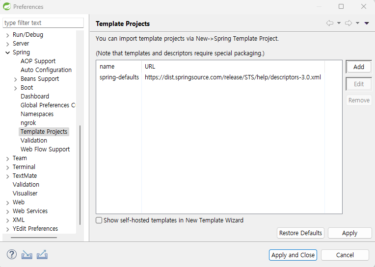 Spring MVC Projext 가 없을 경우에는 Configure templates..에서 Spring-defaults를 제외한 나머지를 remove해준다.