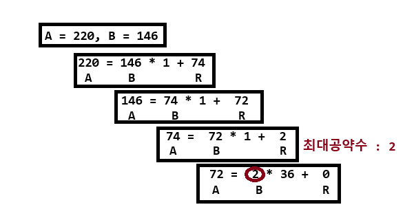 이 때, A & B 의 최대공약수는 B & R 의 최대공약수와 같다는 성질을 갖는다.