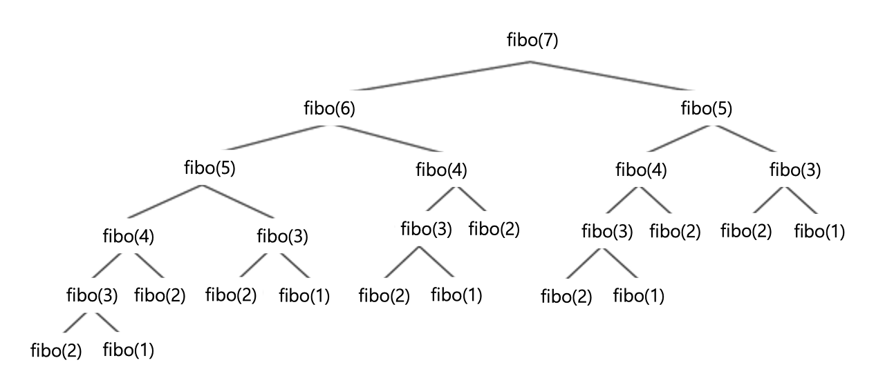 위 사진처럼 피보나치 수열 7번째를 구하기 위해서는 재귀를 탐색하면서 같은 메서드 fibo(2), fibo(1)등을 호출하게 된다.