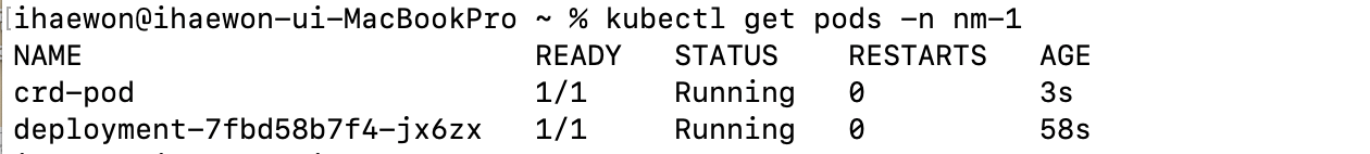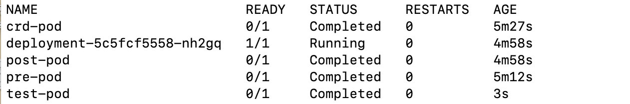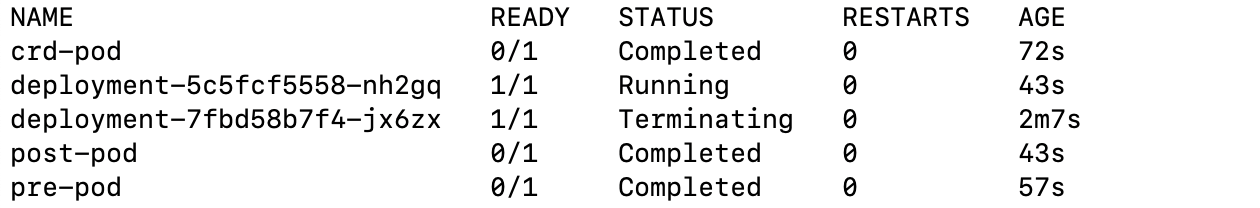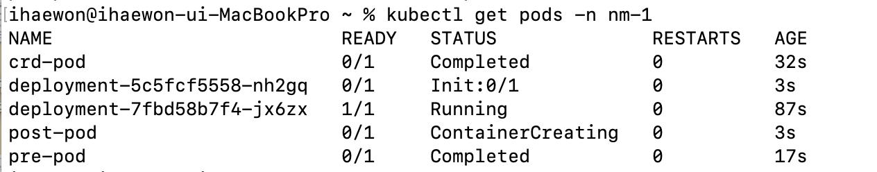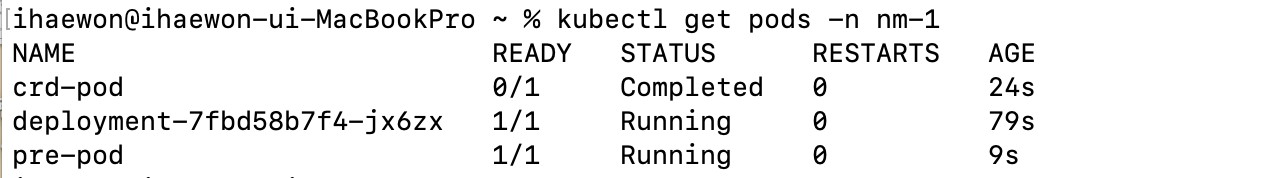 pod의 생성 순서를 보면 crd-pod -> pre-pod 순서로 실행되는 것을 확인할 수 있다.