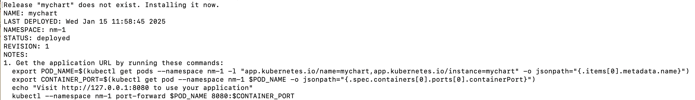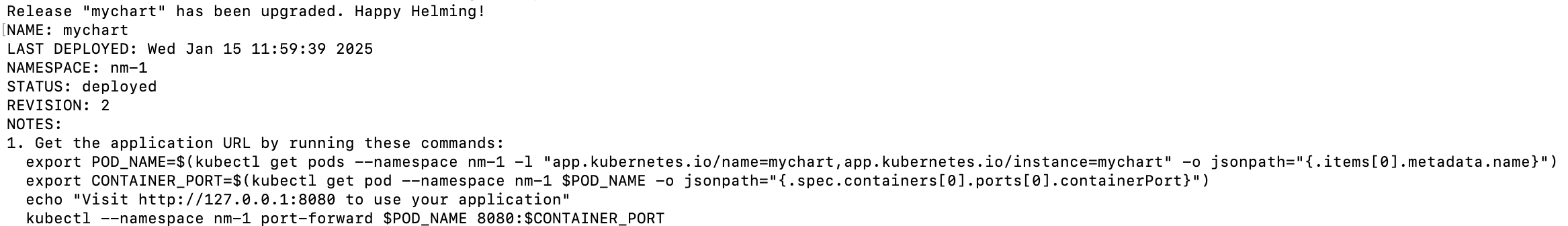 $ helm upgrade mychart . -n nm-1 --create-namespace --install
