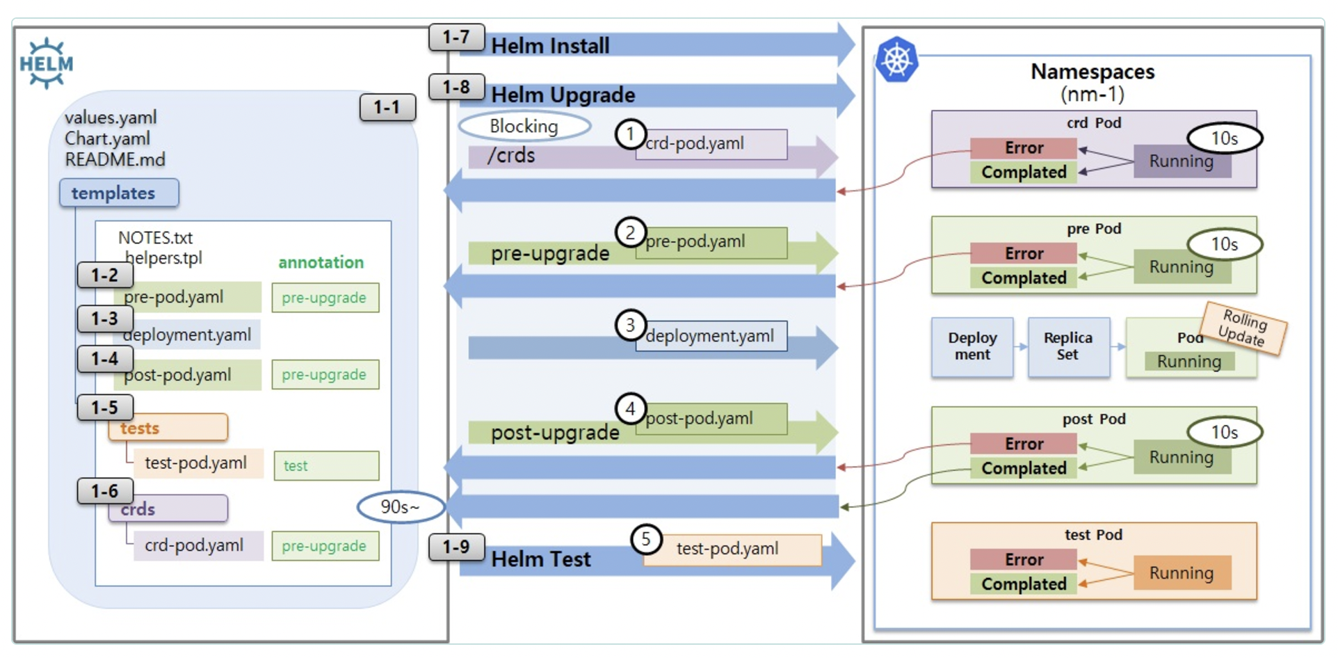 즉 롤링 업데이트의 완료 여부와는 관계없이 deployment.yaml의 배포 작업이 완료된 시점에 post-upgrade를 실행하는 것이다.