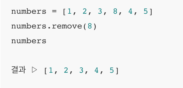 remove메소드는 insert메소드와는 다르게 Index번호를 사용하는 것이 아니라 삭제하고자 하는 값을 입력해서 삭제한다. 만약 삭제하고자 하는 값이 리스트에 존재하지 않는 값이면 ValueError가 발생하게 된다. 또한 리스트 안에 있는 데이터중 중복된 데이터를 제거할때에 remove메소드를 사용하면 Index번호가 작은 값부터 삭제되며, 한꺼번에 삭제되지는 않는다.