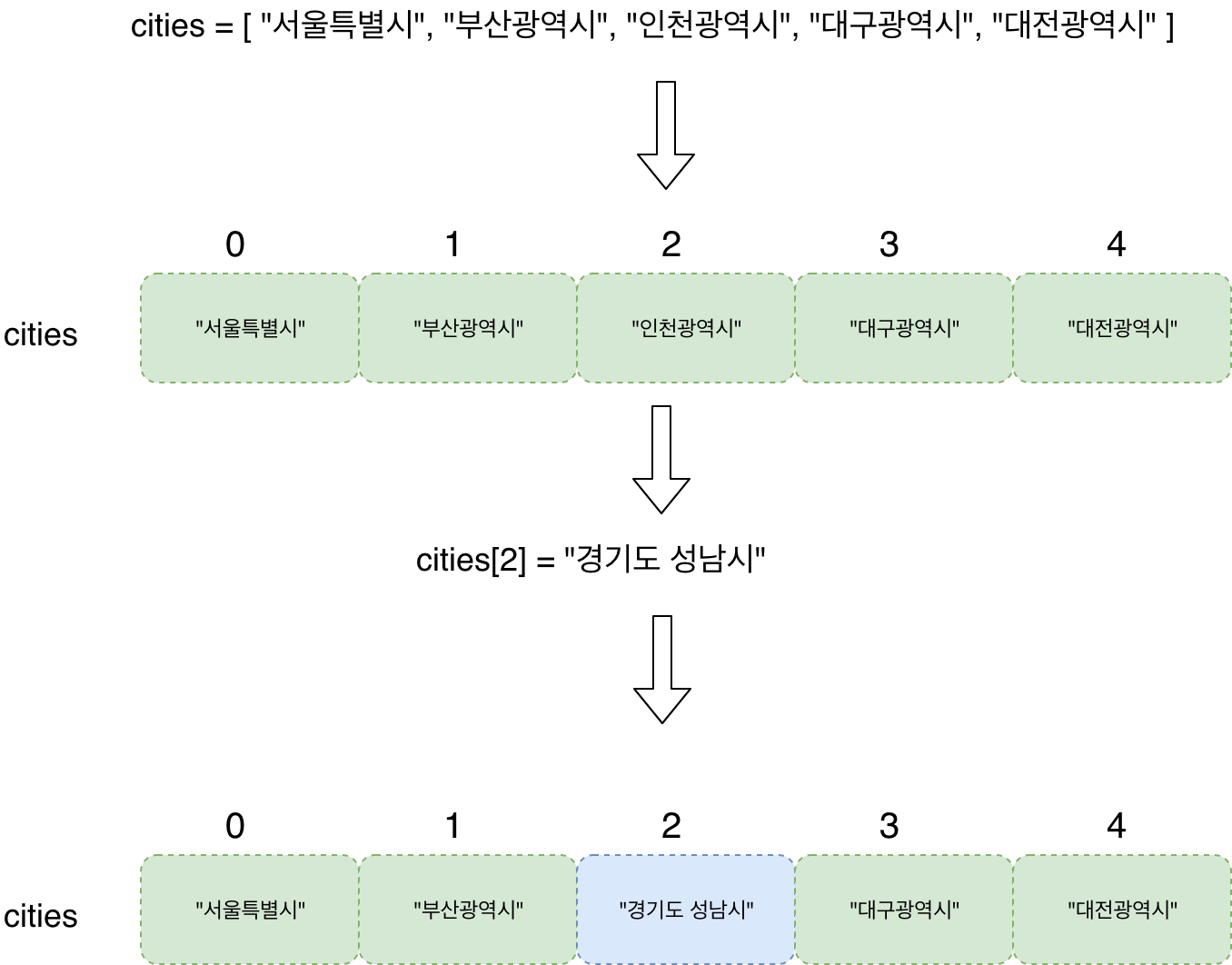 위의 코드를 실행하면 cities 의 3번째 (index는 0부터 시작함으로) element인 인천광역시 가 경기도 성남시로 바뀌게 됩니다.