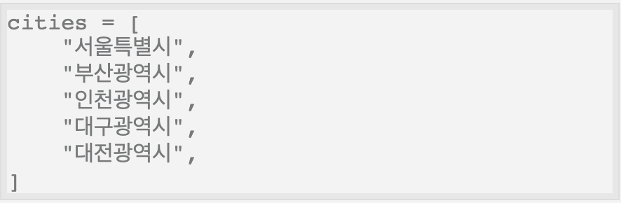 위와 같은 list를 예로 들면 cities 에 "제주특별자치도 제주시" 를 "서울특별시" 다음에 삽입 하고자 하면 다음과 같이 할 수 있습니다.