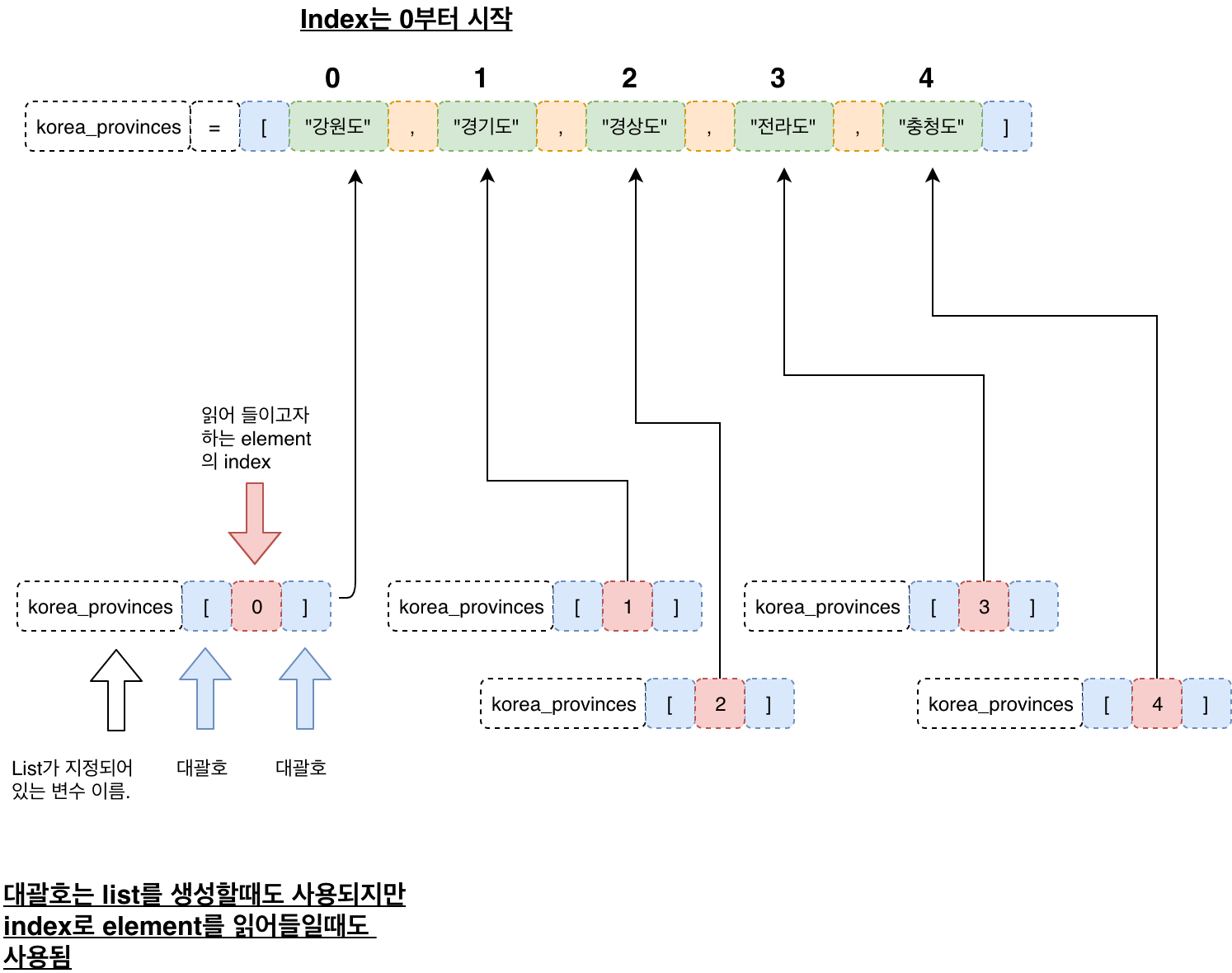 List에 저장되어 있는 값들 중 원하는 값을 읽어들일려면 해당 값의 순서를 통해서 읽어들이면 된다. 여기서 중요한점은 list에서 순서는 0번 부터 시작한다는 점이다. 즉 "강원도" 는 0번이고 "경기도"는 1번 이다. 이러한 순서를 list의 "index" 라고 하는데 index는 0부터 시작하고 index의 마지막은 n-1 (n은 list의 총 길이) 이다.