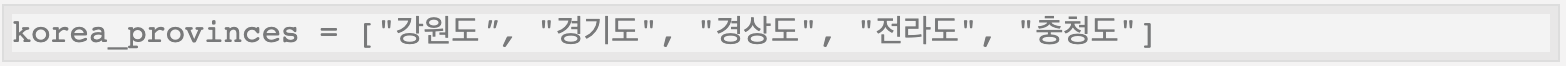 korea_provinces의 경우, "강원도"가 가장 첫번째 값이고 "경기도"가 두번째 이며 "충청도"가 마지막 이다.